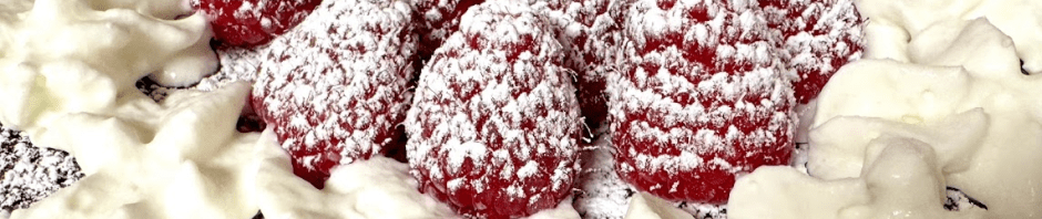 - Once cooled, top with whipped cream, raspberries and a dusting of powdered sugar.