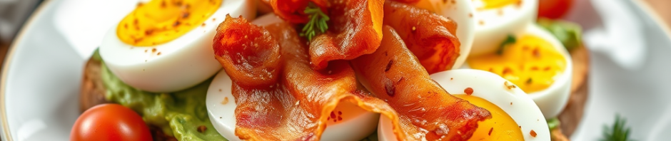 - Roughly chop bacon and spread over avocado, add eggs over bacon.